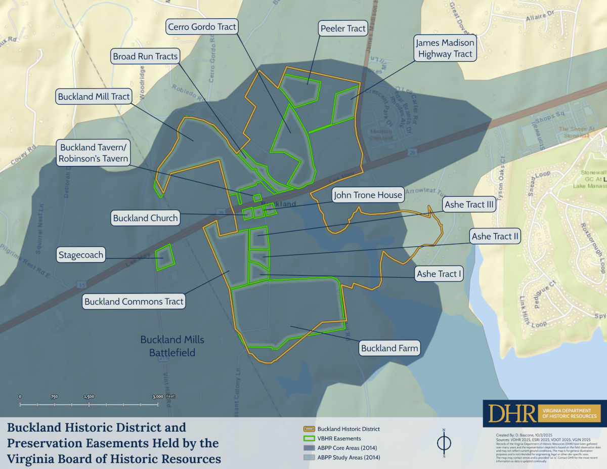 Buckland was first listed in the VLR in 1987 and in the NRHP in 1988. The initial focus was on the town, which was established in 1798, and the nineteen-acre Buckland Historic Overlay District established by Prince William County. In 2008 the area of historical importance was significantly expanded to approximately 410 acres to include numerous archaeological sites relating to Civil War battlefields and the Buckland Farm and Cerro Gordo plantations.